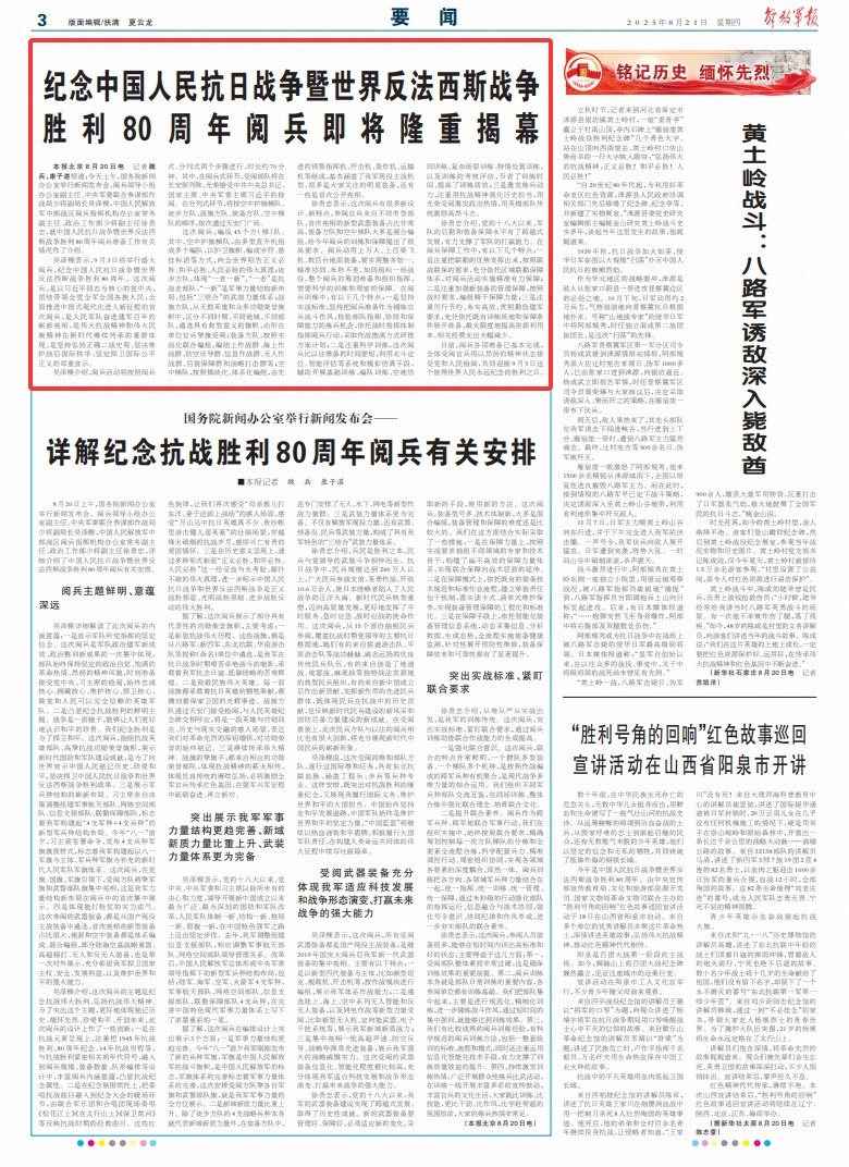 纪念中国战争击败日本入侵和反法西斯战争战争胜利80周年的军事游行即将被释放。 PLA Daily,北京,8月20日。记者Wei Bing和Kang Zizhan报道:今天早上,国务院信息办公室在新闻界举行了一次会议。中央军事委员会联合参谋部行动局副局长兼副局长吴泽克(Wu Zeke)及政治工作部执行副主任徐吉伊斯(Xu Guizhong和反法西斯战争。吴·泽克(Wu Zeke)表示,将于9月3日举行大型军事游行反对日本入侵和反法西斯战争的战争。这次军事游行是中央党委员会的第一次军事游行,其中习近平是主要的,曼联并带领整个党,整个军队以及该国所有族裔的人民在新旅程中全面促进中国风格的现代化。一百年来,这是人民军的新延误,并且在新时代的伟大民族精神。这是对伟大的抵抗战争精神和新时代伟大的民族精神的持续遗产的重要体现。这是一个继续促进第二次世界大战的正确历史观点的庄严表达,该观点决心保留战后国际秩序,并坚定捍卫国际舞会和正义。吴泽克(Wu Zeke)介绍了军事游行将以两个步骤进行:军事游行和游行,持续时间大约是70分钟。其中,在军事游行期间,游行部队与Changan Street有联系,并很荣幸受到CPC中央委员会秘书长,州总裁兼中央军事委员会主席的审查。在二分法中,天安门广场将根据遵守空气旗保护梯队,远足梯队,战旗梯队,设备梯队和空气梯队的依从性提交。军事游行,45平方广场(梯子)团队是固定的。其中,守卫梯队的空中旗由许多直升机组成,并使用守卫的旗帜,形式的角色,悬挂口号向世界表达向世界表达伟大的真理,正义将赢得胜利,和平将获胜,人们将赢得胜利;徒步旅行队反映了“一个古老而又新的”,“一个古老的”是抵抗战争中的一支旧军队,“新”是军事力量结构的新布局,包括“三合一”的武力。战旗tEAM将不同的季节,不同的地区和不同的部队与无数英雄以及许多值得的横幅和荣誉区分开来,并选择选择具有重要意义的横幅,而单位官员和士兵则带着旗帜和那个 - 帕拉德(Parade)游行;设备团队根据实际的联合形成组织,并在地面战斗小组,海上战斗小组,防空小组和反通讯团体,信息小组,战斗集团中间,后方支持小组和战略罢工小组等中组织;空气梯队以模块化和系统的方式组织,由先进的早期飞机飞机,飞机战斗机,消防员,飞机飞机等组成。每个人都关心的星星设备有很多,有些设备首次公开展示。徐吉伊旺说,这次军事游行有许多新的设计和新功能。官员和士兵来自不同类型的部队。新武器和设备被剥夺了很高比例的帐户。大多数旅和空中梯队设备都是混合组群体,对今年的军事游行培训和支持提出了很高的要求。军事游行使用一千人,数百架飞机和公路设备来实现相似之处,准确的协调,并且没有差异。这就像组织一场战斗,计划和准备整个军事游行一样。编织命令需要科学培训和仔细的保证。在军事游行训练中,有以下特征:首先,遵守实用的战斗标准,主张使用军事游行准备作为练习的机会,以履行官员和士兵之战风格,测试部队的命令,协调和支持能力,依靠战争战争命令军事巡游的行动,并命令第二次科学训练,并专注于科学训练,并专注于科学训练,并依靠这一局限于科学训练,并依靠战争范围。G,军事游行比以往任何时候都要短,并使用诸如Beidou定位和智能评估和模拟技术等系统来帮助基础培训,开发培训,空中合作培训,复杂的场景培训,特殊培训,培训和评估评估,节省培训时间,培训时间以及提高培训质量和效率;第三,刺激训练的动力,专注于对日本的战争战争来增强历史责任,利用光荣的游行来刺激政治热情,并利用英雄和模特的传统来激发战斗的高度精神。徐吉伊旺(Xu Guizhong)提出,自从中国共产党第18个国民大会以来,军事支持和军事支持的水平就发展出了跨越,以强烈支持陆军获胜的能力。在军事游行支持工作中,有以下特征:首先,我们专注于提供完整的演奏物流联合的好处,以及根据联合战争和联合安全的要求,我们完全依靠物流的联合支持系统来实施准确而有力的军事游行活动的保证;其次,我们专注于加强新设备的管理和保证,并根据战争要求,我们组织了支持支持的能力;第三,我们专注于旧培训,是务实有效的,实施了陆军组成的要求,完全依靠现有的培训场所,并保证进行准备,以大大减少相关的资金支出,以进行准备,使资源使用量。目前,军事游行的所有准备工作通常都完成。游行中的所有军官和士兵都将受到党派和精神上增加的人民的审查,并共同欢迎9月3日,这是胜利的一天,值得对T的永恒纪念他的世界。