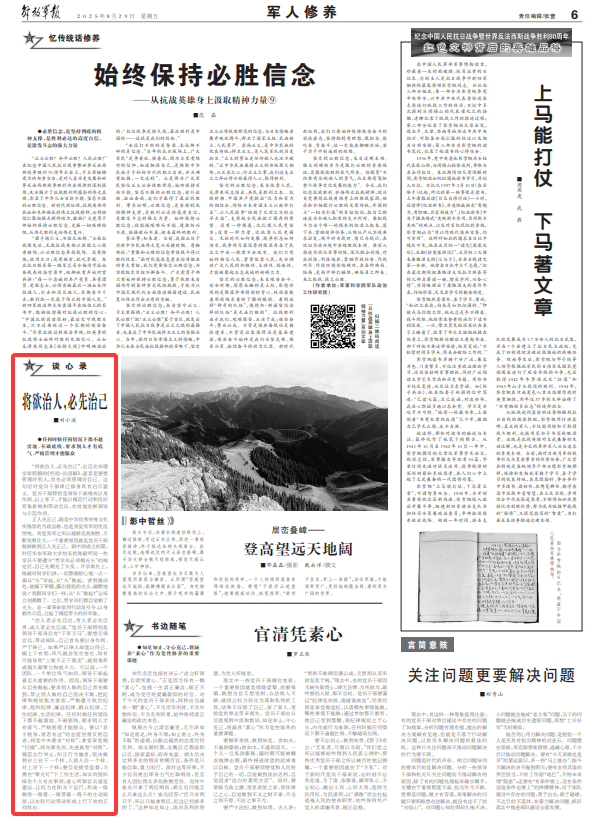 如果将军想监督他人,他或她必须首先自我修复■刘小宝●不要在任何时候或在任何情况下都超过线路或打破底线。只有任命他人有信心和严格的管理,才能说服公众。 “如果将军想监督他人,他或她必须先自治。”它源自北方歌曲王朝的新苏联主义者郑伊(Cheng Yi)的“佛经:对孔子的分析的解释”,这意味着,如果您想正确管理他人,则必须首先正确地管理自己。该句子的灵感来自党员和干部的自我歧视。仅通过设置一个实例和领先的干部就可以受到党员,卡德尔官员和士兵的影响,并具有示例性的行动和良好的形象,并有效地发挥了领导力和示威的作用。对他人的纠正首先进行正确的纠正。这不仅是中国伟大的礼貌角色辐射文化,这也是我们政党和军队的伟大传统。我们的政党和军队能够击败敌人并继续成长的重要原因之一是党员和干部可以纠正他人,最重要的是。在建立新中国的早期,东中国军事和政治大学校长陈伊(Chen Yi)听到一些学生不想遵守“学生应该剃光头”的法规,首先剃了头发。在开幕式上,陈伊告诉学生,应该从“ head” na Little中知道一切,然后从“头”开始。当他感到兴奋时,他移开了军事掩护,展示了他的闪亮的秃头,然后说得很有趣:“像我的同学一样,我从“头”开始!”观众立即感到兴奋。之后,学生有意戴着头。老一代的革命家庭使用行动发出命令并提出,并建立良好的领导形象。 “那些统治他人的人必须首先是自我管理,那些责怪他人的人必须首先责备自己,而成年人必须首先实现自己的目标。”党员和干部,尤其是领先的干部,在他们身后拥有“成千上万的部队”。如果他们想统治官员和士兵并领导部队,那么您必须树立榜样并独自严格。如果您对他人严格,但热衷于自己,并且在上层和下层之间有所不同,则环境将会改变,这可能导致“上梁不是笔直的,下梁是弯曲的”,并且很难建立战斗的牢固统一性和有效性。可以说,顶级干部在团队或单位的环境中起着重要作用。因此,顶级干部应该从自己开始,要求其他人做他们首先做的事情,决心不做禁止做的事情,优先考虑纪律和规则,以及严格遵守政治纪律,组织纪律,诚信学科,大规模纪律,工作纪律和生活学科。在任何情况下,在任何情况下,您都不是线条或打破底线。只有命令他人有信心和严格的管理,您才能说服公众。我们应该始终以“一位绅士的态度”的态度来思考自己,如果他总是犯错”,“基准”与党委员会的要求,“扫描”,“扫描”,党的宪法和党派规则“比较”祖先,烈士和高级模型,与他们的言语相同,同样的行为,同样的行为,相同的行为,相同的行为,相同的行为,相同的行为,相同的行为,相同的行为,相同的行为,相同的行为,相同的行为,相同的行为,相同的行为,相同的行为,相同的行为,相同的行为,是相同的。实践,相同的实践,相同的实践,相同的实践,相同的实践,相同的实践,相同的实践,相同的实践,相同的实践,接下来是相同的做法,相同的行为,舞台上的事物,在他人面前的人们;我们必须故意接受政府,习惯于在“聚光灯”下工作和生活,向组织报告个人对象,谦虚地倾听官员和士兵的意见和建议,让该权力在Araw中起作用,发展一个生动的状况,其中一个水平可以实现A级别的水平,并在水平上掌握一个水平,以工作,并以实用的效果进行实用的影响,以实现效果,从而促进了对ASSED的影响,并逐步效应。