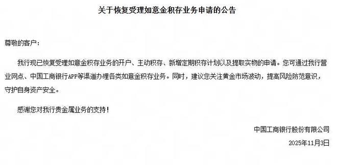 图为工行公告截图。 11月3日晚间,工商银行发布公告称,继续受理如意金积累业务开户、主动积累、新增定期积累计划、实物提款申请。用户可以通过营业网点、工行APP等渠道办理如意金的各项累积服务。同时建议关注黄金市场波动,提高风险防范意识,保护自身资产安全。