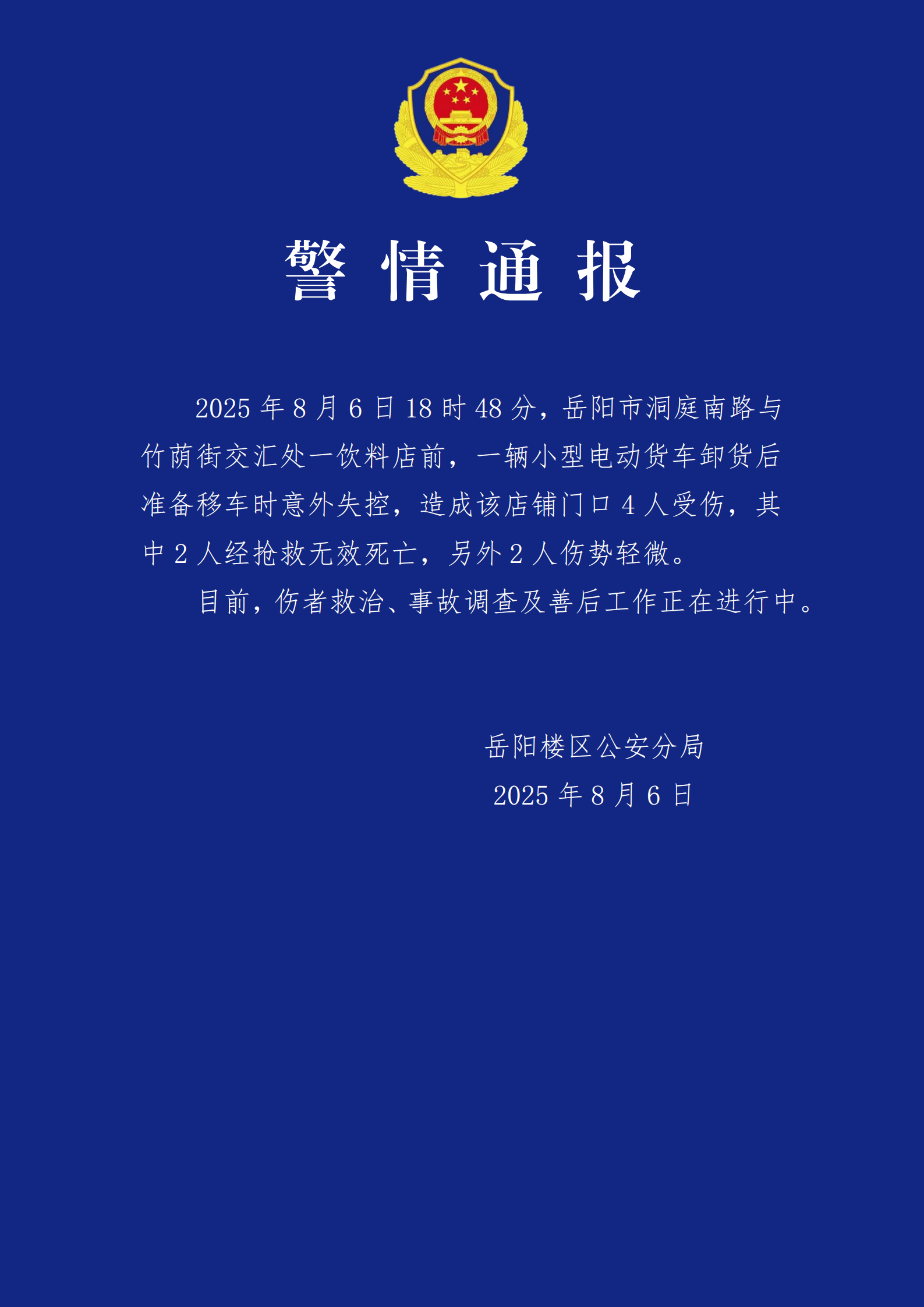 8月6日,许多网民在社交媒体平台上发布了视频,称一辆带有“ Kudi”商标的小型卡车在商标上印有商标,落入了荷兰省阳市Yueang区的Chayan Yuese商店。在线视频显示一些公民受伤,引起了在线关注。那天晚些时候,洪南省的Yueyang City的Yueyanglou地区公共安全局发布了有关此事的警方报告。该通知指出,在2025年8月6日的18:48在饮料店前的一家饮料商店前,在东路加东路和杨阳市的Zhulang街的交汇处,这是一辆小型电动卡车,这是一辆小型电动卡车,在拆除汽车并准备移动汽车时,造成了两人在商店中受伤的两人,两人在造成了两人的入口处,并在两次造成的死亡中受伤,并在其他人身上受伤。未能营救后死亡,另外两个人受伤了。目前,受伤的治疗,事故的调查然后进行。南方网络,广东学习记者李 上一篇:Nansha计划的第一阶段通常完成 下一篇:没有了