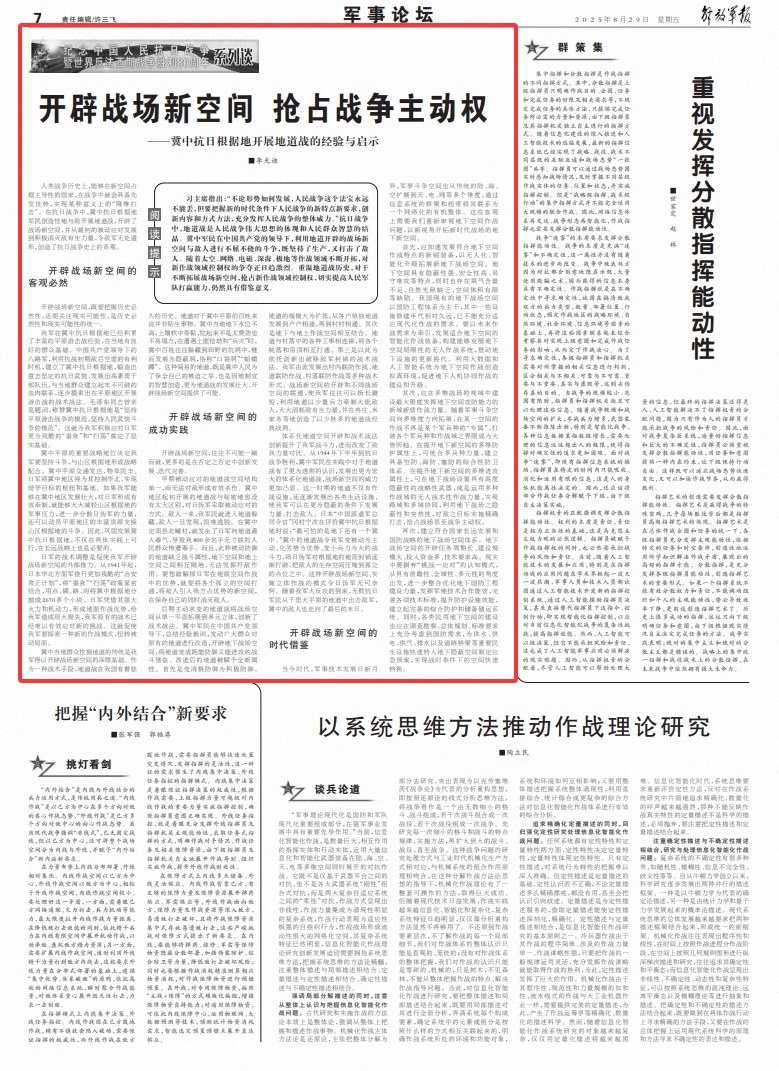 在战场上打开新的空间,并占据战争 - 中国 - 中国 - 中国 - 中国 - 中国 - 中国 - 方法,以及人民的要求,方法,方法,方法和需求,方法,方法和全部作用。在中国共产党的领导下,河北的军事和平民利用隧道打开的战场空间在不可否认的斗争中与敌人作战,既主张工作又攻击敌人。随着空间,网络,电磁,深海和极地地区等战场的持续发展,控制新战场的竞争变得越来越激烈。重新审查隧道战争的历史仍然是参考对于持续扩大新战场空间,抓住新战场的控制,并有效提高人民军队获胜能力的重要性。在人类战争的历史中,可能会主导新的空间将具有战争中第一名的优势,并在某种意义上实现“降低降低性打击”。在反对日本侵略的战争战争期间,中央河北的反日基地地区的军事和民用与敌人一起创造了创意隧道战争,开设了新的战场空间,并从最初的被动反应开始发展,以积极地消除敌人的生活历史,使敌人无处躲藏起来,在反对下午袭击的战争中造成了惊人的袭击。开放新战场以开放新战场的客观需求。我们不仅应该了解不可避免的历史,而且还要注意实际的可能性。这是历史不可避免和现实的可能性的统一。我们的军队积累了普通游击战的丰富经验,在中央河北的反日本基地,在当地拥有良好的群众基地。第八路under the leadership of the Communist Party of China took aDVANTAGE OF THE FAVORABLE OPPORTUNITY OF THE EMPTINESS BEHIND THE ENEMY IN THE EARLY STAGE OF THE WAR OF RESISTANCE AGAINST JAPAN to establish the HeBEI-central anti-Japanese base area, forged a firm-willed anti-Japanese armed force, developed a high-quality cadre team, established an unbreakable fsh-and-blood ties With the local people, and gradually explored the tactics and tactics of bringing guerrilla war to simple地方。赫比中央平原的重要战略地位是指我们的军队应该继续与山区基地斗争并建立战略合作。 Hebei Plain开发了运输和丰富的资源。日本军队将河北地区视为枢纽及其控制中国北部并实现攻击中国的目的的基础。如果我们的军队能够在中部的河北地区发展和发展,并有效防止日本军队,那么戒烟将减轻军事压力在山区基地上,进一步传播了日本和木偶部队的力量,并将丰富的资源转移到平原上,以支持山基地的斗争。因此,结合和开发赫比中心的抗日基本区域不仅可以通过特定的实践,而且在长期的方法中也是必需的。日本军队的战术安排是促使我们的军队在战场上开设新空间的外向推力。自1941年以来,日本中国陆军已经实施了一个严厉的“公共安全纠正计划”,与“邪恶”和“扫地”结合在一起,并分裂了基于河北中心的267区,有分数,封锁,道路和运河。超过0个小块。通过强大的火灾和机动力量,日军形成了战斗,这给我们的军队带来了巨大的损失。我们军队的最初策略不再有效应对新挑战。这促使我们的军队探索了新的蝙蝠TLE模式并扭转被动情况。赫比中部探索真正的隧道的当地人的传统是我们军队在战场上开放新空间的深刻基础。作为一种战术方式,隧道中的战争在我国拥有悠久的历史。真实的人不熟悉河北平原的人。中央河北的地下水位不高,土壤柔软而粘稠,不太难以挖掘,也不容易掉落。当被土匪和“军事灾难”遇到时,赫比中部的人们经常躲在农场坑中,然后发展成隐藏的孔,通常被称为“口袋孔”和“蟾蜍下蹲”。这种简单性和真实性不仅是河北中心人民保护自己的强迫姿态,而且是适合当地条件的明智创造,它还为在隧道和战场上新空间开放的战争和开放提供了可能性。成功开放新战场的技能d开放新的战场通常无法在一夜之间实现。这更多是关于通过否定来改变和发展,避免和改进。简单地回应第一阶段的隧道战争是统一的结构,无法有效地杀死敌人。一开始,在赫比地区中部的隧道中战斗与秘密地窖没有什么不同,它对日军和木偶采取了被动反应。敌人到达后,我们的军事和平民将进入隧道以躲藏。当敌人发现它时,很难逃脱。在赫比中部的迪利普县贝蓬村,日军将有毒气体倒入隧道中,造成800多名非武装人士被杀害。此外,这条被动防御隧道缺乏战斗的特性,地下和上层空间彼此隔离,无法扮演敌人的灭绝角色。如果您想打破J的好处亚太军队在地面太空之战中,您应该打开所有单独的空间,向敌人介绍我们的主要新空间,并在维护自己的同时移走敌人。积极寻求最终阶段变化的隧道战争将战场的空间从一架飞机扩展到了多样化的三振源,以及创新的战术和战术。在中国共产党的领导下,赫比的军事和平民总结了他们的经历和课程,扩大了群众以改变原始的隧道,打开了地下空间,并将通风口变成了可能是防御性和进攻的战斗。增强的隧道具有新功能。第一件事是将被动防御更改为主动防御。隧道的大小从每个家庭的单个隧道形成到每个家庭之间的联系,再到每个村庄之间的联系。第二个是集成n地下及以上空间。隧道将各个堡垒连接到村庄,该村庄将每个露台和屋顶连接起来。第三个是用作现代化塔基卡和战术以打破敌人封锁的基础。因此,我们的军队开发了各种战术形式,例如基于村庄的防御行动,隧道防御的联合行动以及基于村庄的村庄行动。战场上新空间的开放以及各种战场空间的连贯性使我们的军队经常发挥其优势并避免其弱点,使用通风孔防止大量具有小部队的敌人,完全消耗敌人的生命力量,并在Ranzhuang,Mijiafu和其他地区创建经典的战斗例子。隧道空间