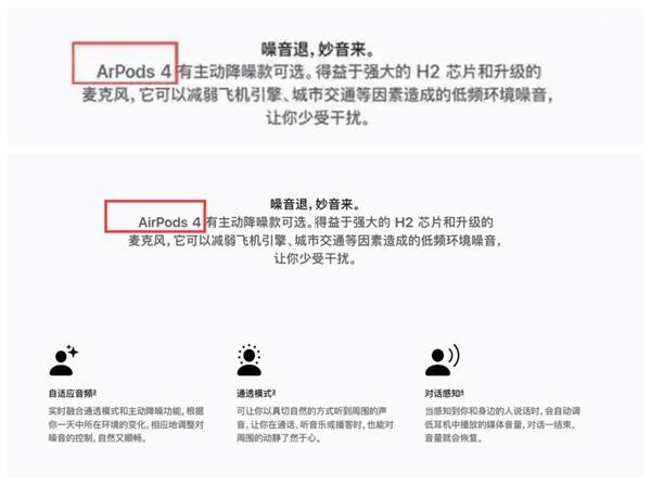 快科技10月12日报道,网友发现苹果中国官网AirPods 4耳机介绍页面存在错字。最初的“AirPods 4”被写成“Arpods 4”,但苹果官网立即纠正了这个错误。资料显示,AirPods 4是苹果2024年秋季发布会上推出的产品。这款耳机的一大亮点就是降噪。得益于强劲的H2芯片和升级的麦克风,可以降低飞机机器、城市交通等因素引起的低频环境噪音,让您少受打扰。据苹果介绍,AirPods 4支持自适应音频,并具有实时集成透明模式和主动降噪的功能。它可以根据iY全天环境的变化相应调整噪音控制,使其自然流畅。透明模式可以让您真实、自然地听到周围的声音,让您打电话、听音乐或播客时注意周围的动静。而且AirPods 4具有感知对话的能力。当您感觉正在与周围的人交谈时,它会自动降低耳机上播放的媒体量。通话结束后,音量将恢复。该产品售价999元(支持主动降噪版本售价1399元)。