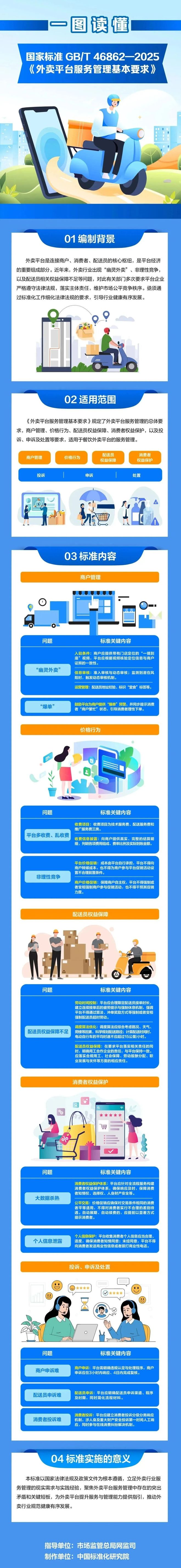 外卖推荐性国家标准发布实施 市场监管总局近日发布实施外卖平台推荐性国家标准《外卖服务管理基本要求》。该标准旨在有效帮助外卖平台优化管理流程、提升服务质量,实现各方共赢,进一步推动外卖行业的创新发展和良性竞争。该标准立足行业实际,针对外卖行业突出问题。聚焦平台内商户管理,引导外卖平台切实履行食品安全主体责任,保障消费者舌尖安全”;聚焦收费平台和促销行为,引导外卖平台简化收费规范促销行为,营造公平有序的市场竞争环境;重点抓好平台打工管理,加强配送人员劳动工资、工作时间、社会安全等权益保障。外卖“新国标”有哪些新变化?一张图看懂↓isan 图源:新华社