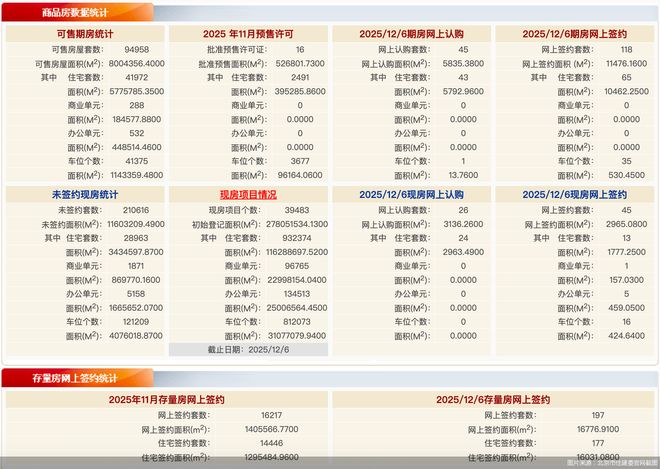 新闻快讯讯(记者 王银浩 李涵)据北京市住建委官网数据,12月6日,北京新房网上签约163套,面积14441.24平方米,其中住宅78套,面积12239.5平方米;网上签约二手房197套,面积16776.91平方米,其中住宅177套,面积16031.08平方米。