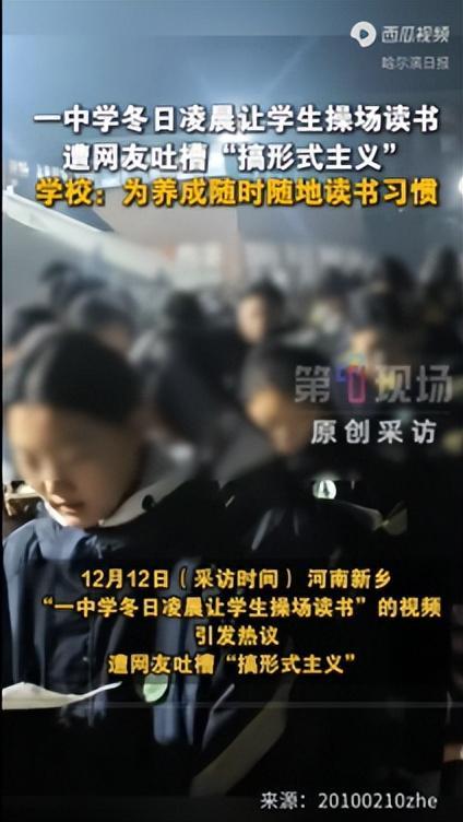 在河南新乡,一段“初冬时节,一所中学让学生在操场上学习”的视频迅速在网络上传播,立即引发网友热议。视频中,冬天的早晨,天还未亮,校园操场冰冷。一群穿着厚重冬衣的学生,在昏暗的灯光下,抱着书,瑟瑟发抖地朗读。这一幕被上传到社交平台后,网友纷纷吐槽学校的做法“形式主义”。网友的质疑不无道理。初冬的早晨,这是一天中最冷的时候。温度很低。在这种环境下,学生的身体要抵御严寒,很难集中全部精力来学习书本知识。而且,早上人的生物钟处于睡眠状态,大脑没有完全清醒,学习效率势必会大打折扣。不少网友认为,学校应该要注重实际的学习效果,而不是做那些看似重要实则华而不实的事情。面对网友的质疑,学校工作人员做出了回应。他们说学生们只在操场上学习了几分钟。工作人员直言:“我们也知道,在操场上读书并不能真正学到很多扎实的内容。”从学习知识的角度来看,在这样冰冷、不适宜学习的环境下,学生机械地朗读,很难真正理解和吸收书本上的知识。不过,学校组织此类活动也有自己的考虑。工作人员强调,此举的重要性是告诉学生养成随时随地阅读的习惯。在他们看来,学习不应该局限于教室的课桌,也不应该在舒适的环境中进行。生活中会有不同的情况和环境,学生需要培养在任何条件下冷静下来学习的能力。通过在冬日早晨的操场上读书,学校希望向学生们传达一个理念:无论户外环境多么艰苦,都不应该放弃学习,应该热爱每分每秒去获取知识。学校的考虑并不是绝对的,这是不合理的。当今社会,竞争日趋激烈,人们需要不断学习、提高自己。养成随时随地阅读学习的习惯,可以让人们在有限的时间内获得更多的知识和信息,从而更好地适应社会的发展。从长远来看,培养这种习惯对于学生的成长和未来的发展有着积极的影响。但与此同时,学校也应该认识到,在实施此类措施时,应充分考虑学生的实际情况和感受。如果你瞎了只注重形式而忽视对学生健康和学习的影响,最终可能会适得其反。学校可以用更科学、更合理的方法,在不影响学生正常学习和休息的情况下,培养学生随时随地阅读的习惯,比如组织一些户外阅读活动,但要选择更合适的时间和环境。这样才真正达到培养学生学习习惯的目的,让学生在健康、高效的学习环境中成长。